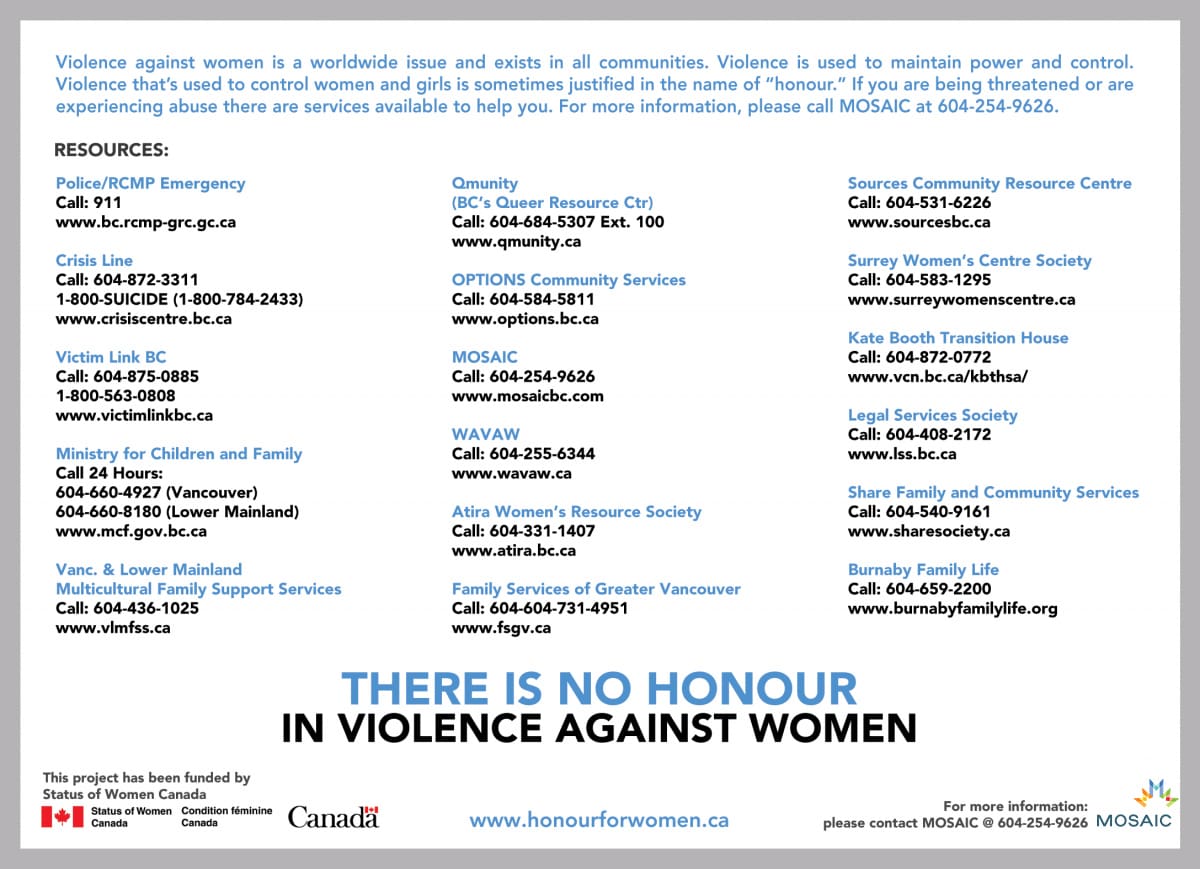 Violence against women is a worldwide issue and exists in all communities. Violence is used to maintain power and control. Violence used to control women and girls is sometimes “justified” in the name of “honour.”